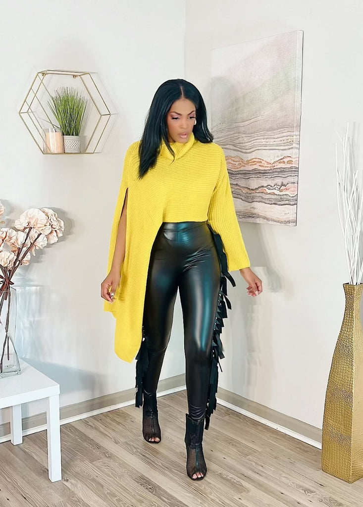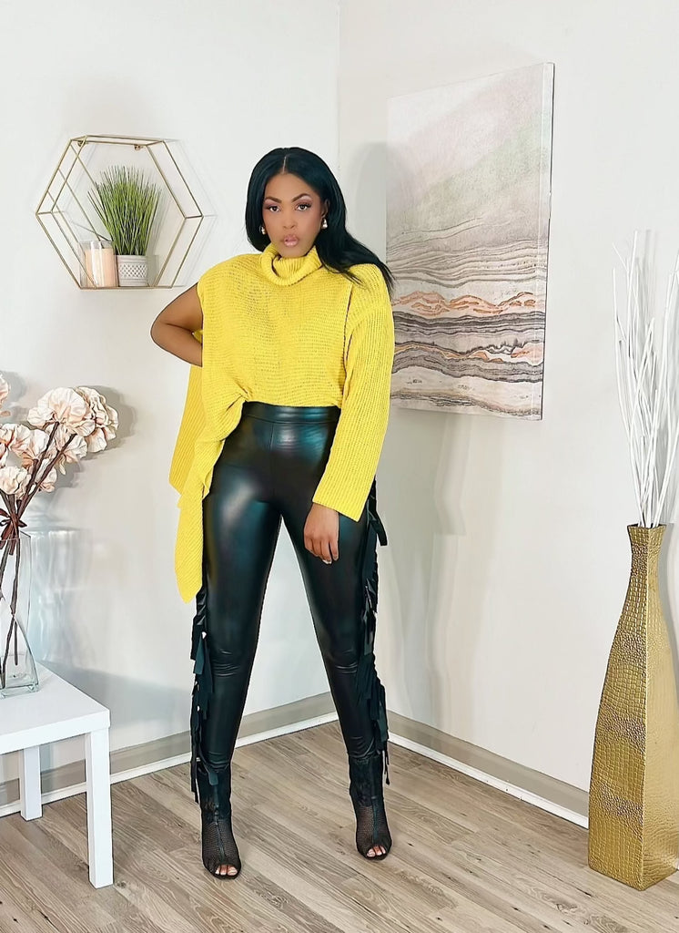 High waist, black vegan leather pants with fringes along the side of pant leg. These pants have good stretch and snatch.