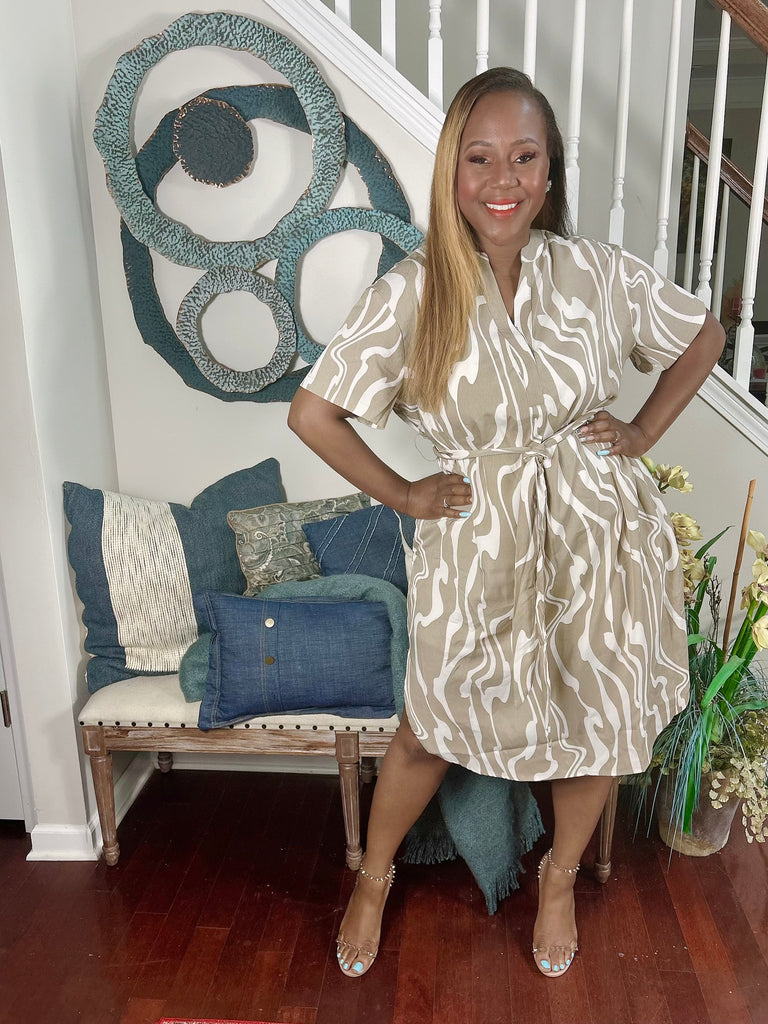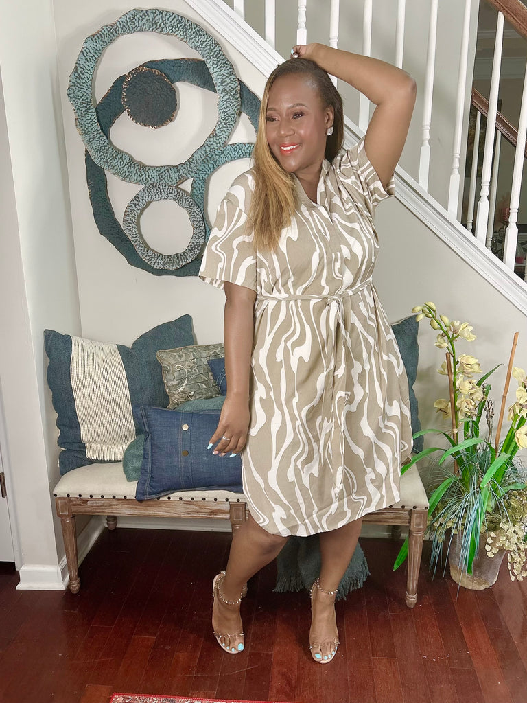This smock-cooled, short sleeved, button-down, neutral swirl dress has a versatile sash and pockets. Offering style and sophistication with its calm colors and loose fit, there are small splits on each side to add character. Model is wearing a 1X.