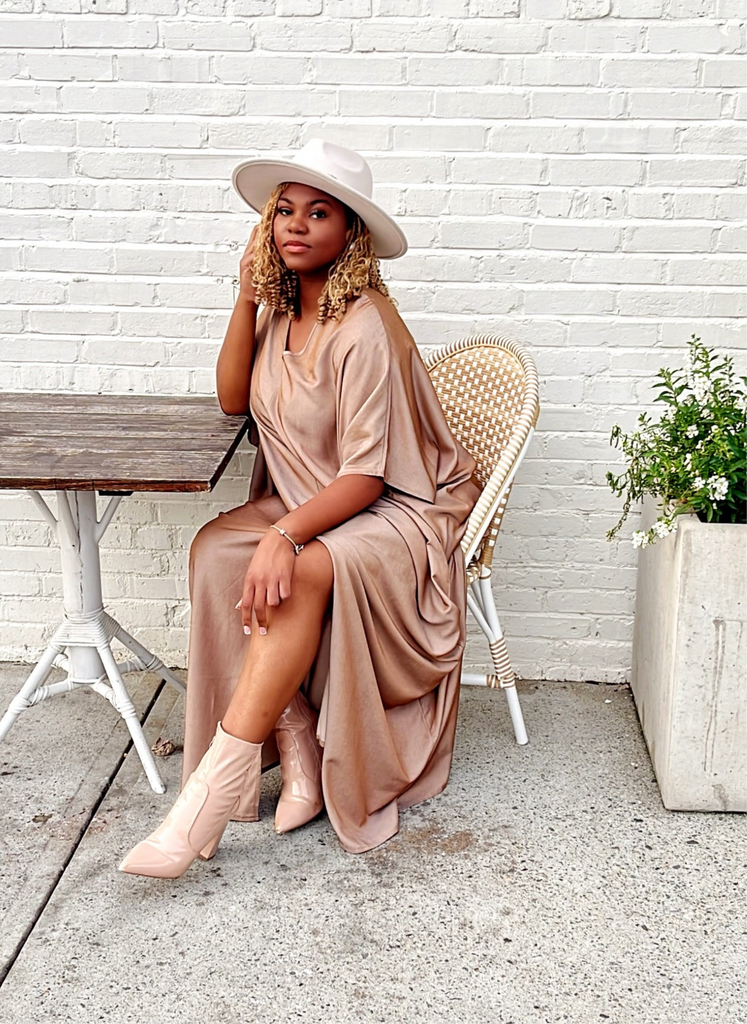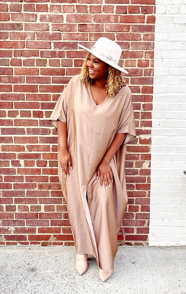This oversized, batwing kaftan dress with deep-v neckline, pockets and front split that gives unexpected and effortless sexy! The gworls that get it, get it!