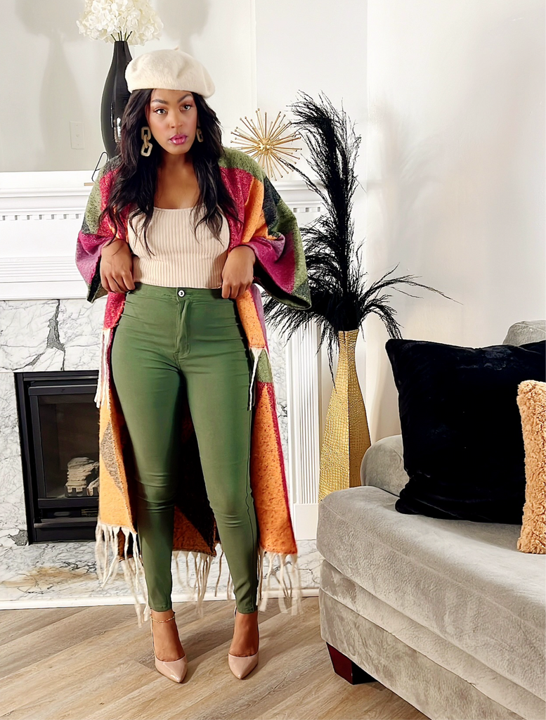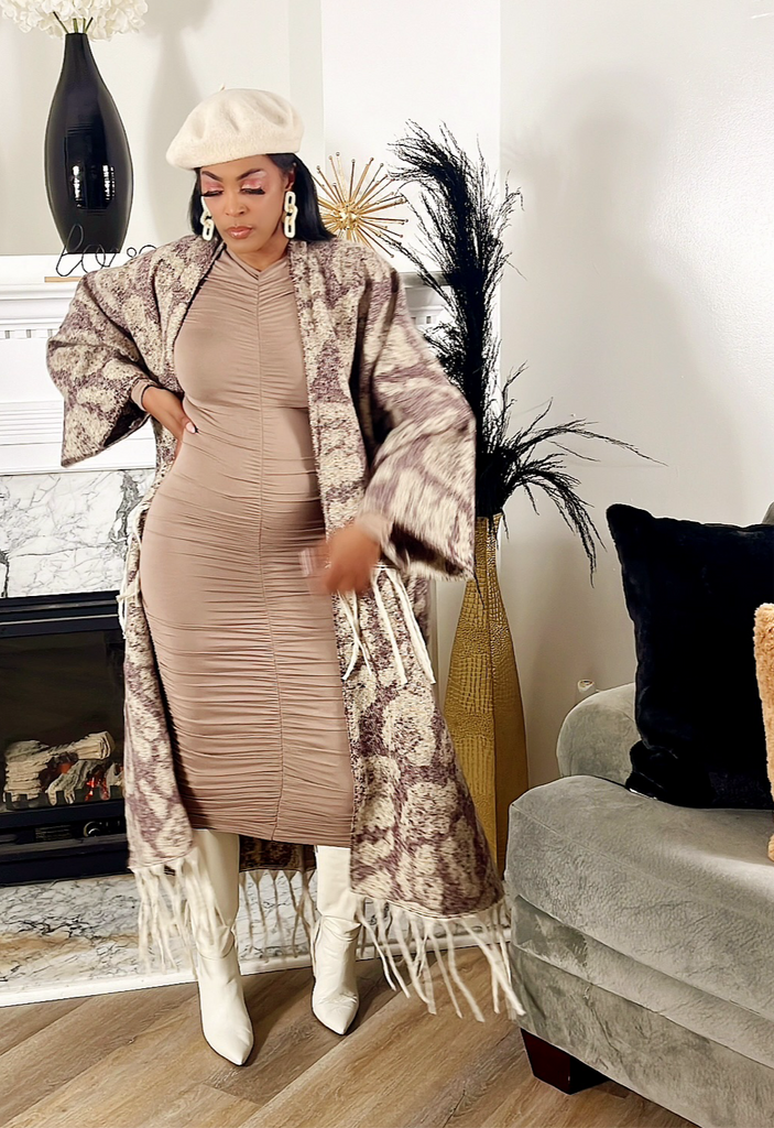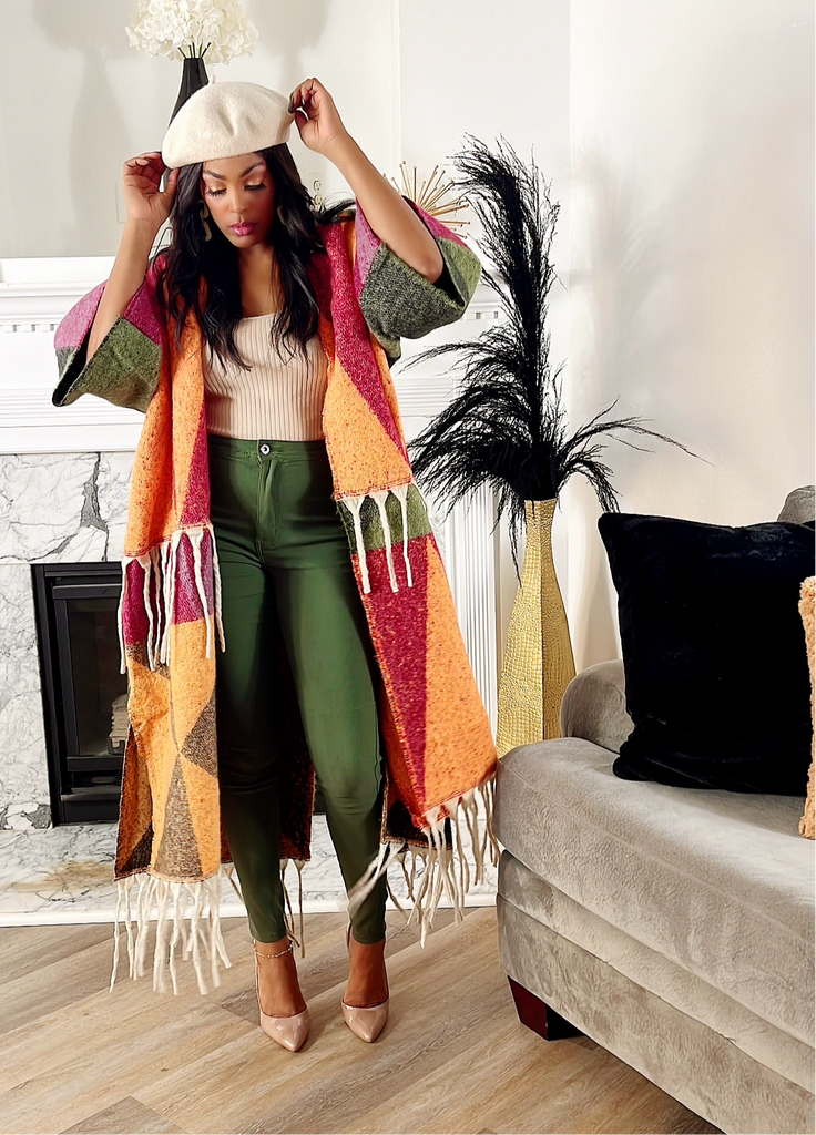 One size fits all, thick, oversized, batwing duster with off white fringes.