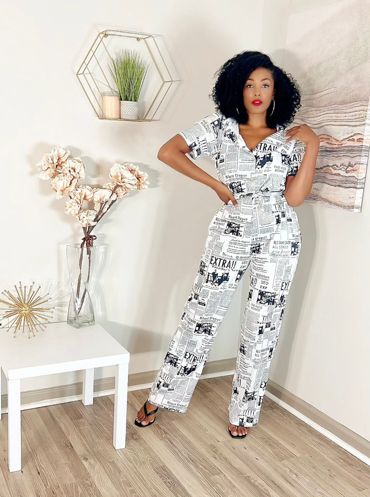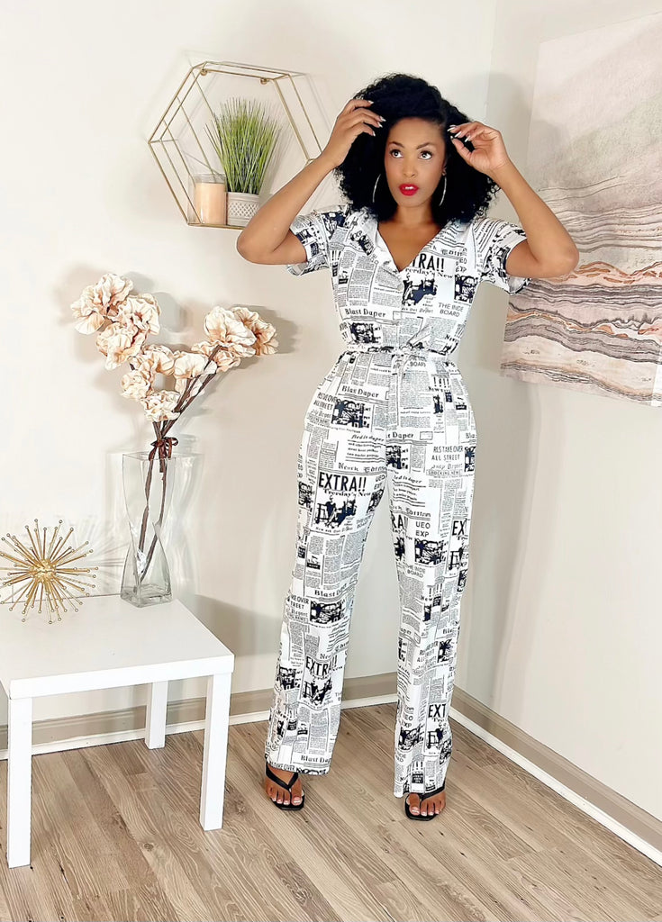 Wide leg, newspaper print jumpsuit with elastic belt, pockets and matching belt. Jumpsuit is cut very roomy, so you have the option to size down.