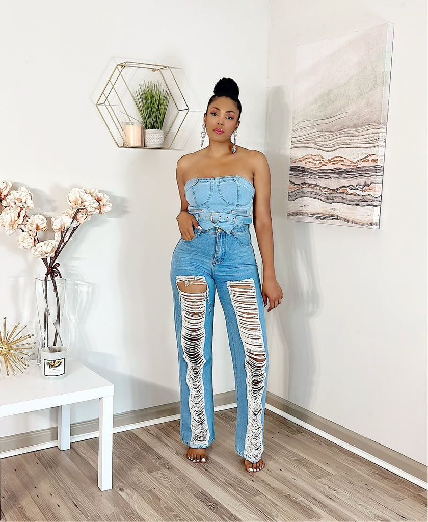 Corset style sleeveless, denim crop top with a matching belt and back zipper closure. This top has a lot of stretch.