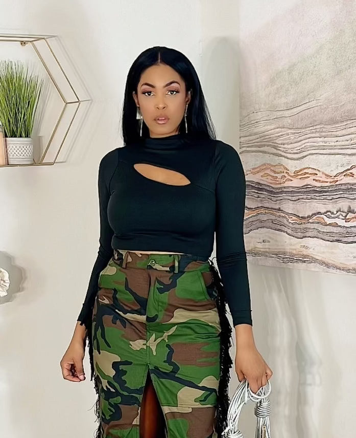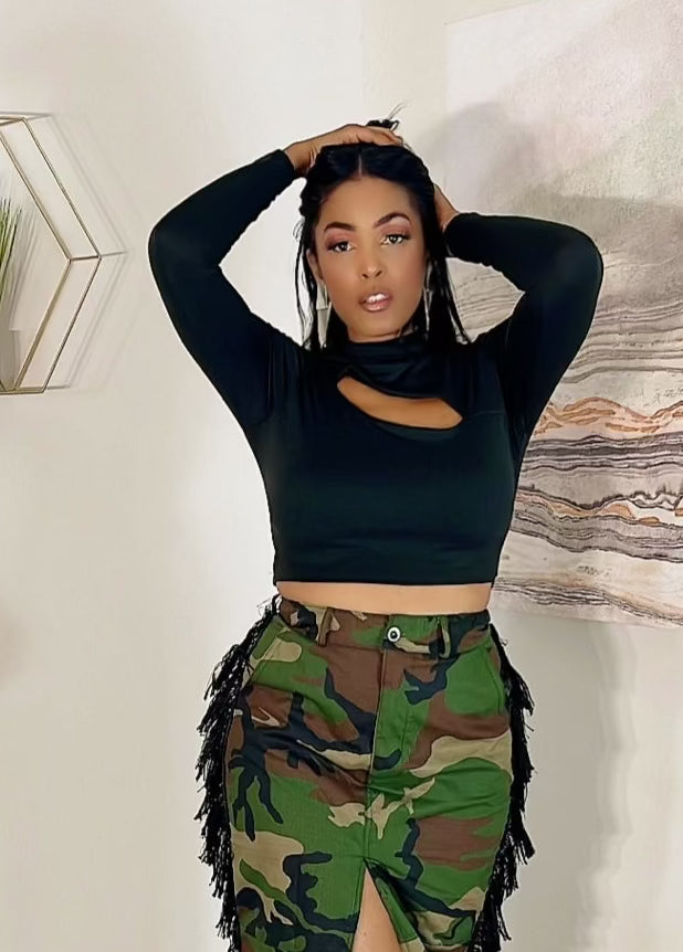 Long sleeve, mock turtleneck crop top with a key hole opening on the chest. Very stretchy!