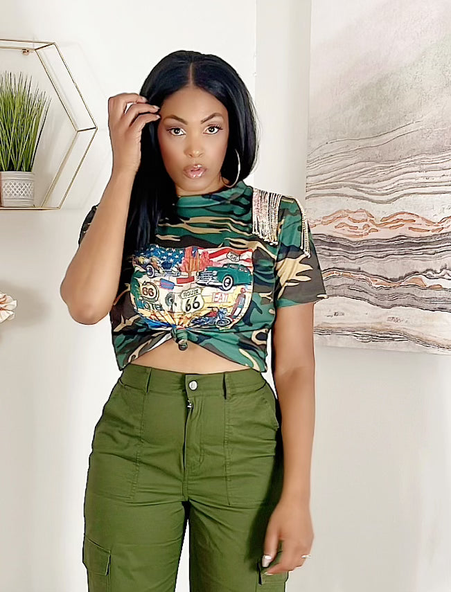 Where camo meets bling, this crop top is so freakin cute. We love the rose gold and rhinestone shingles on the shoulders that takes this top to another level.