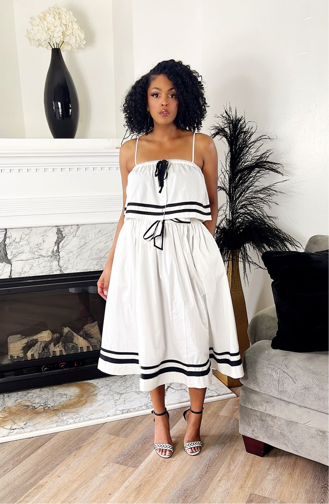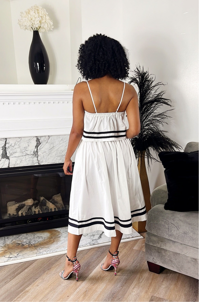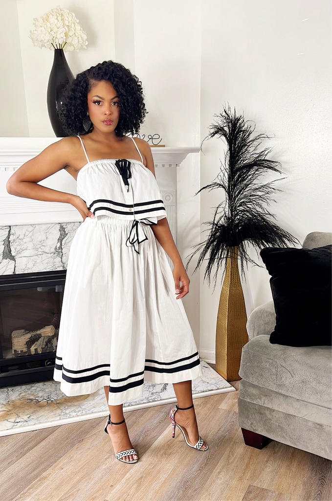 Two piece cotton skirt set with double-lined black trim. Top is cropped and ruffled with adjustable straps and elastic band. The skirt is an A-line modesty and elastic, drawstring waist.