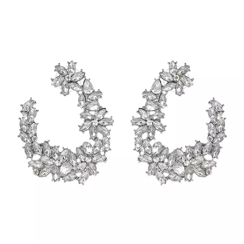 Crescent shaped faux earrings featuring flower shaped diamonds.
