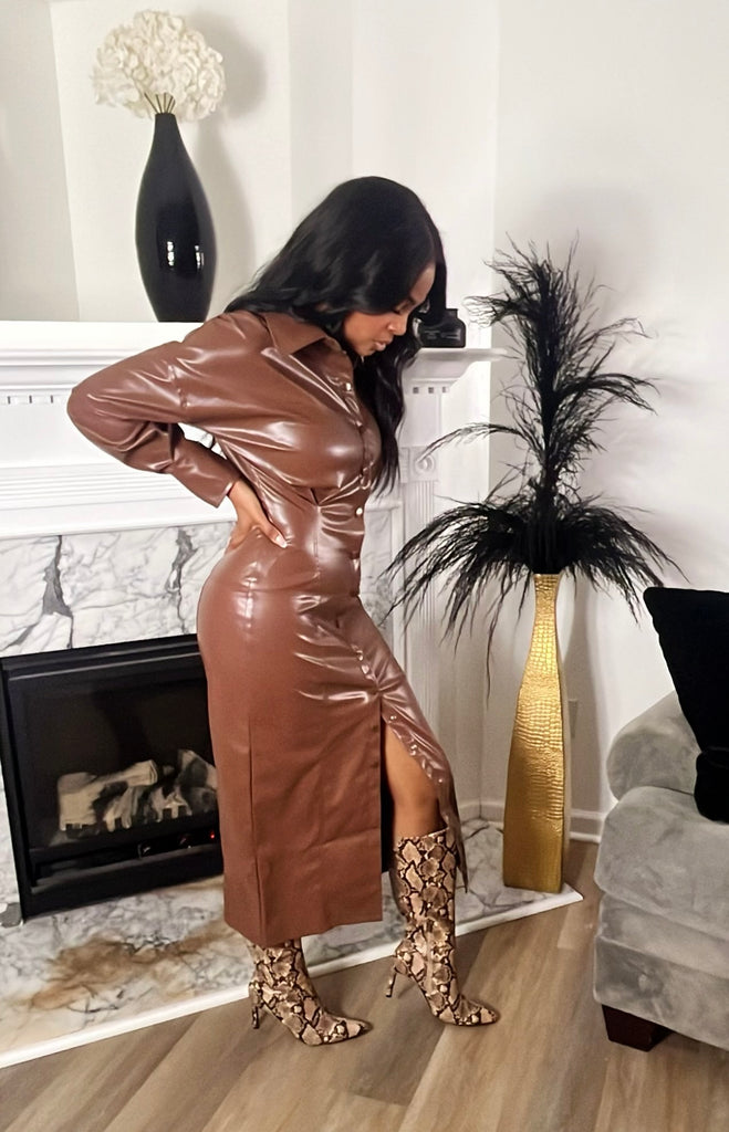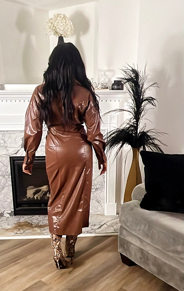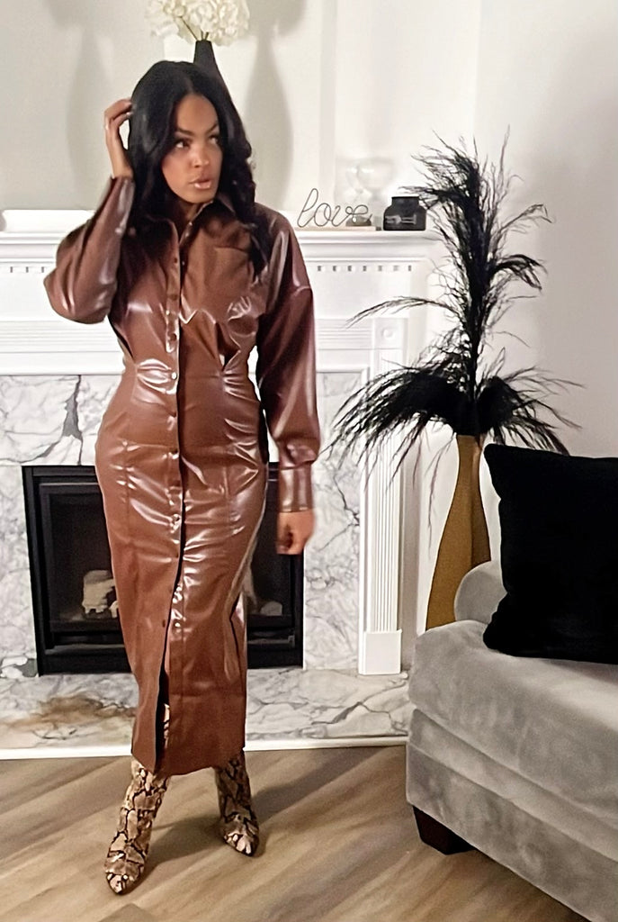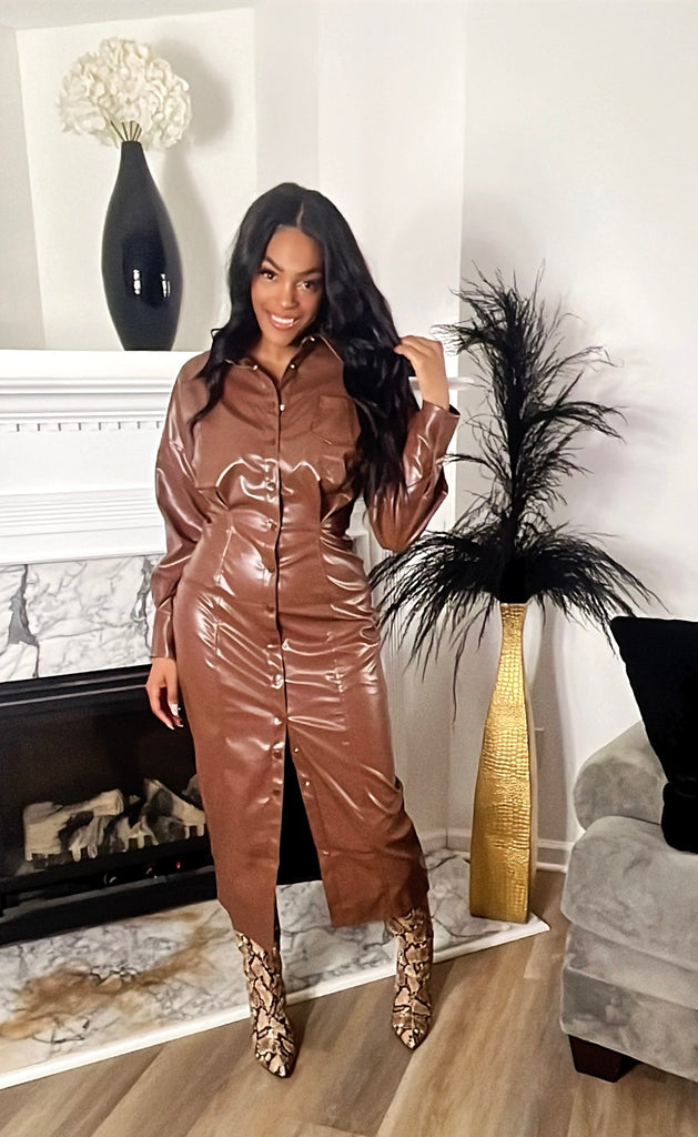 Turn heads in this super cute and sexy vegan leather maxi dress that features a darted waist to give you that snatched waist below loose fitted top and sleeves. The dress has snap buttons down the front and can be worn as a duster!! The dress is very stretchy!
