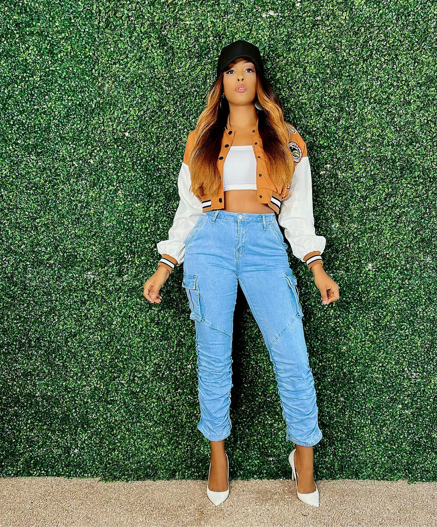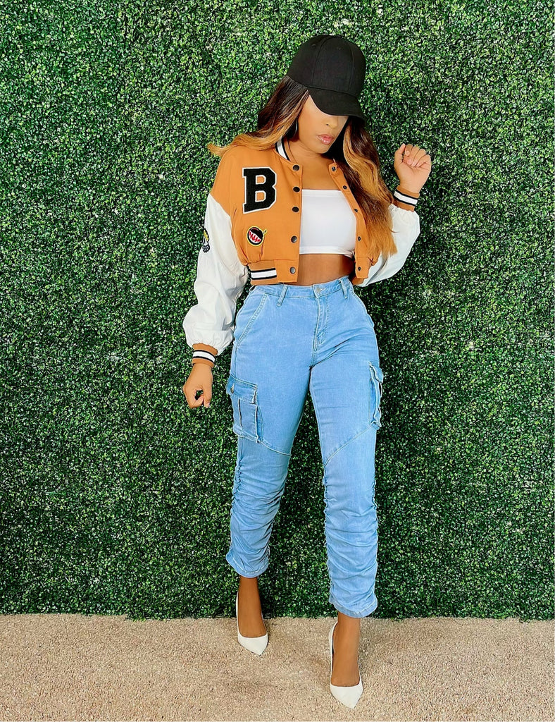 Super cute, varsity crop jacket with various patches on front of jacket and vegan leather sleeves, pockets, and black button closure. The jacket is lined.