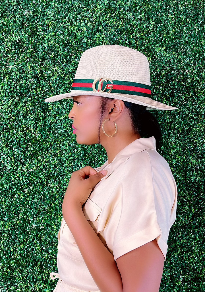 Straw, fedora hat with red and green ribbon and gold letters.