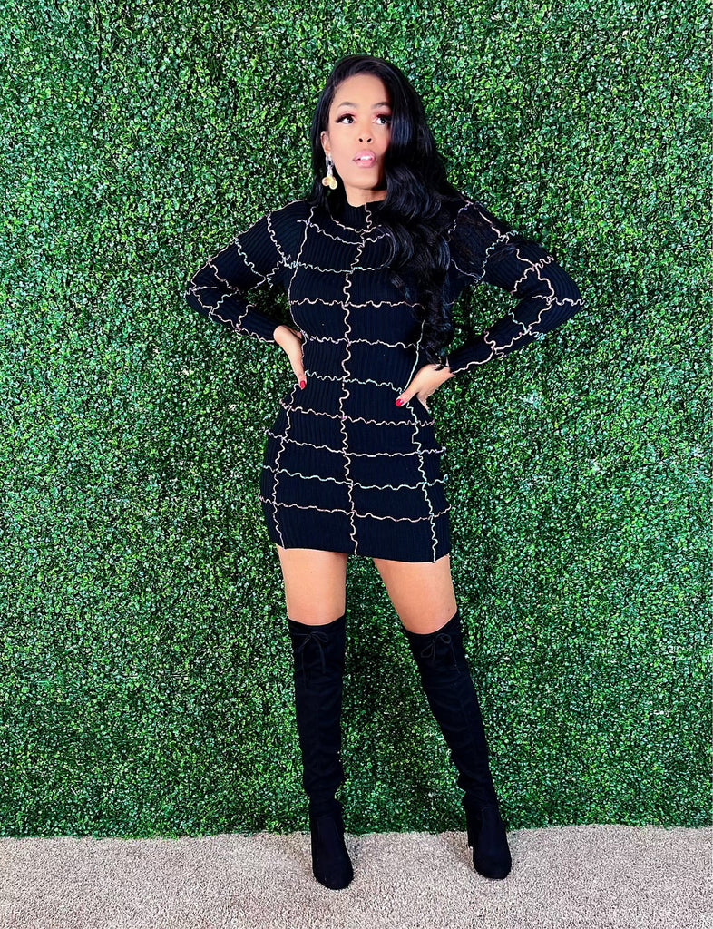 The LBD with a twist. This turtleneck, long sleeve body con features colorfully stitched lines giving the on-trend, inside out look. This dress is very stretchy, thick and soft. It’s made to hug your curves in all the right places.