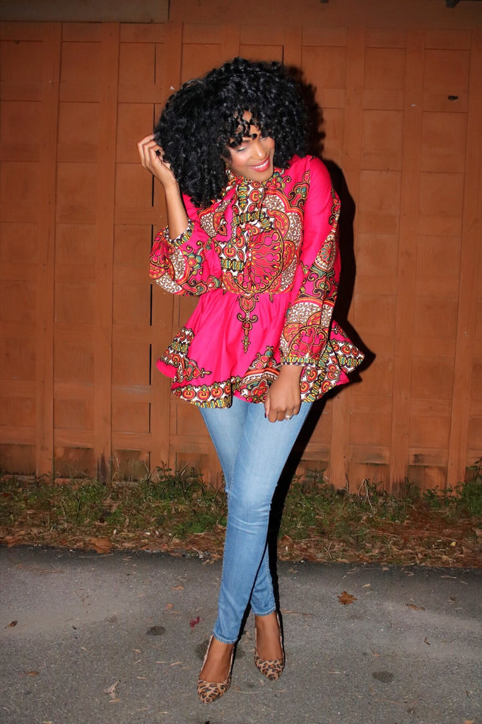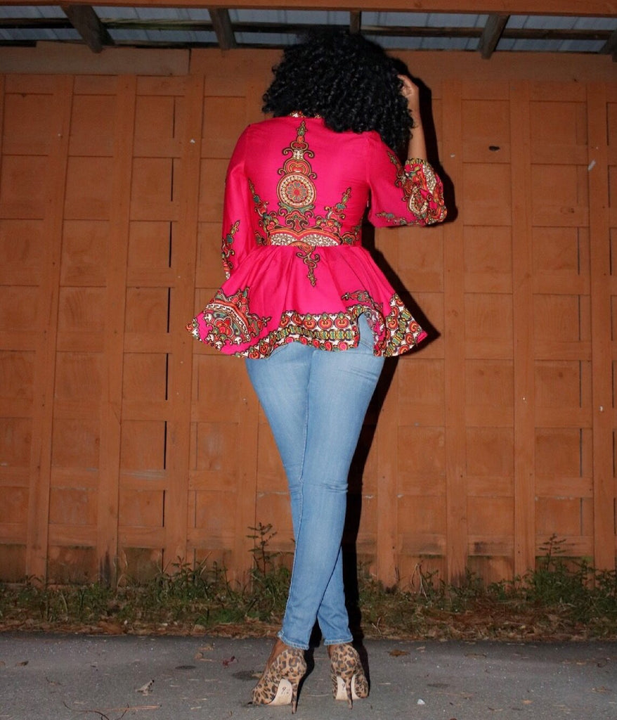 Peplum style Ankara top with side zipper closure and bow. Fits true to size.