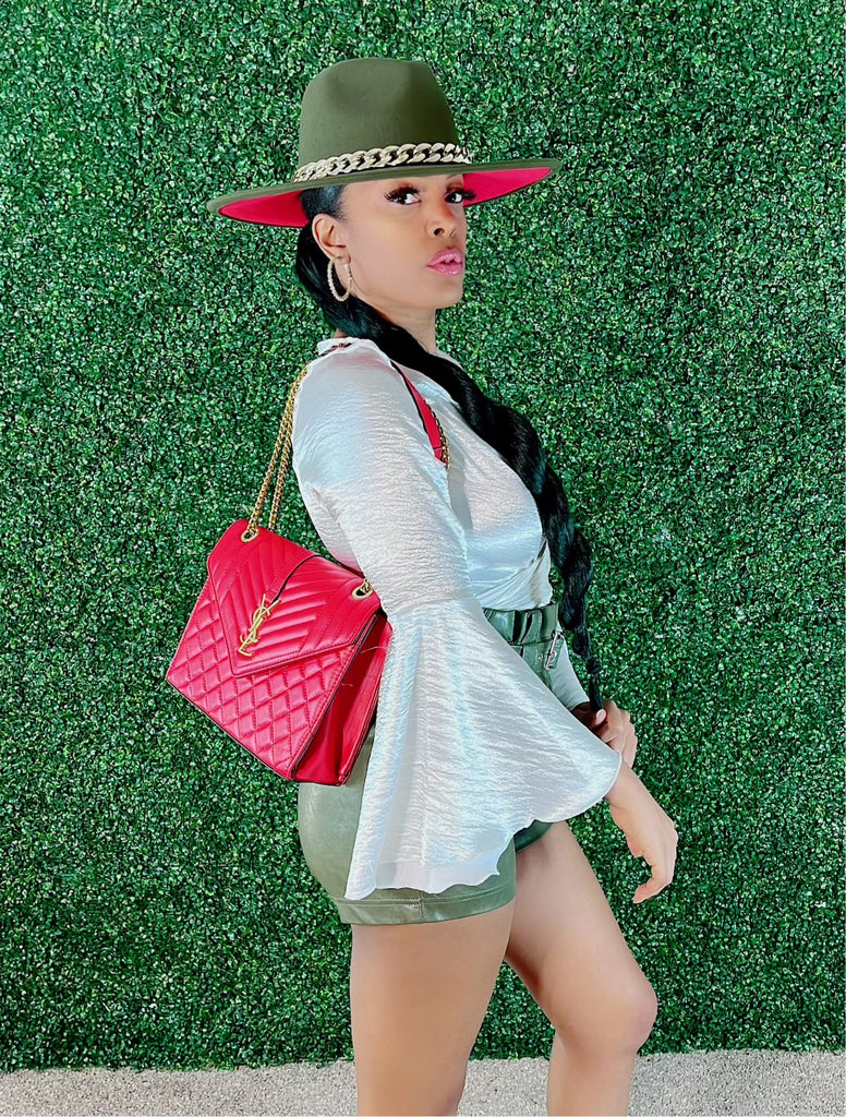 Fabric fedora hat with thick gold chain and contrast red inside.