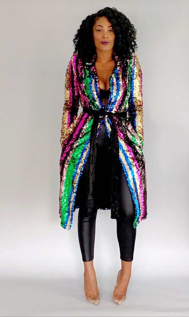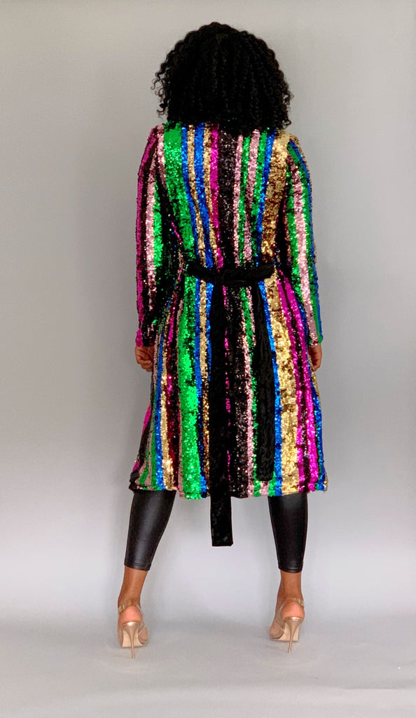 3/4 length sequin jacket with colorful striped design, velvet belt and pockets. Single button closure and fully lined. Amazing quality!