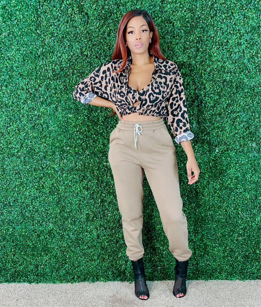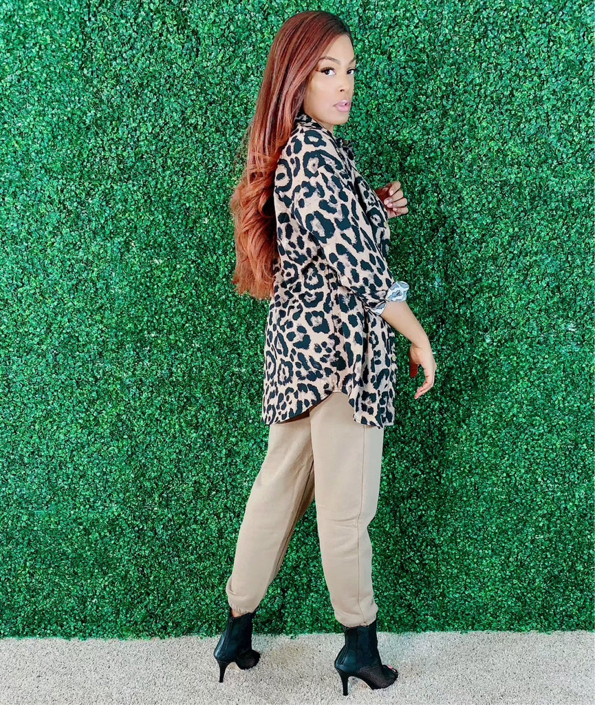 Look chic and put together in this matching leopard, bralette and oversized top set. The bralette has adjustable straps and an elastic back with attached ties that wrap around the belly. The shirt snaps to close.