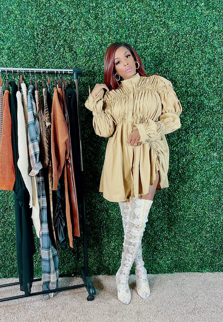 Stand out in this gorgeous, irregular cut dress with extreme ruching on the chest and sleeves. The dress includes a front button closure and can be worn as a top as well.