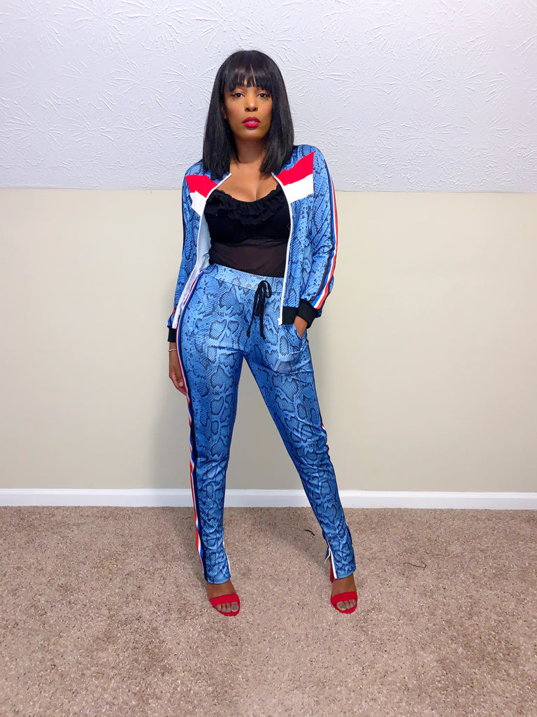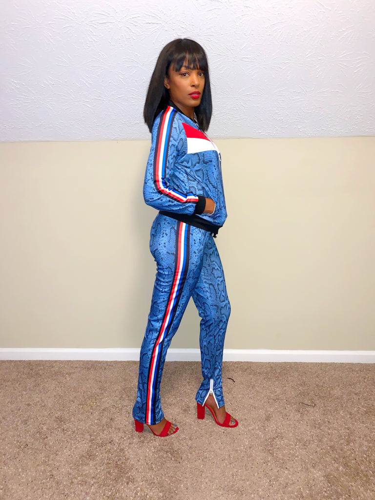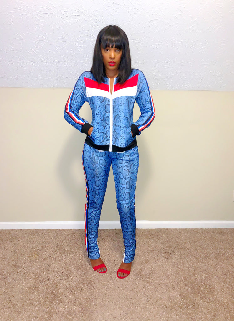 Dress up your track suit collection with this little snakeskin number. The color is gorge and the feel is smooth. Very stretchy with elastic waist and pockets on the jacket and pants.