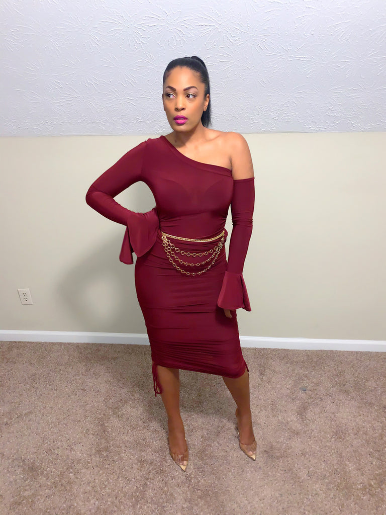 Matte jersey, asymmetrical dress with sleeves and drawstring sides and amazing stretch. Dress can be shortened for a midi dress look.