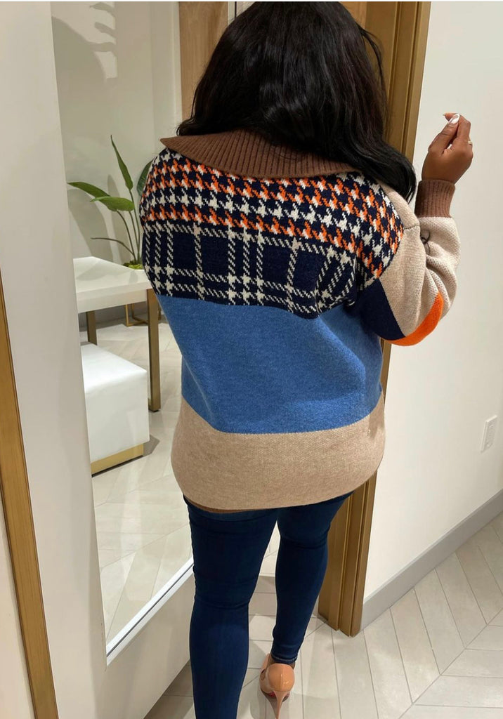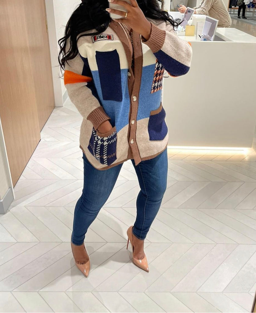 Thick, oversized sweater cardigan perfect for the winter. Features contrast print, oversized pockets and large, brown marble buttons.