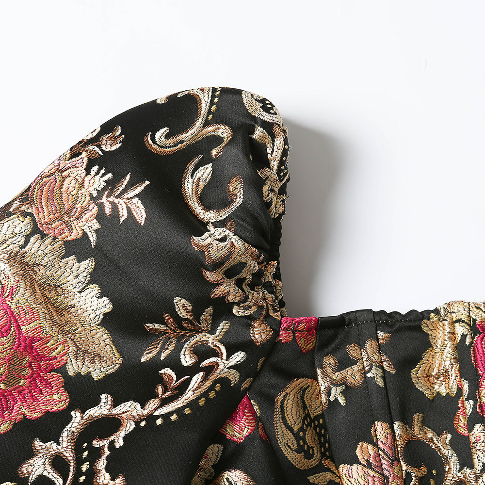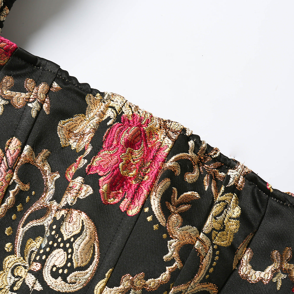 Bustiers are a must have for spring, and this brocade print top is absolutely stunning. Wear it tucked in some high waist pants or out. Features puff short sleeves and back zipper closure.