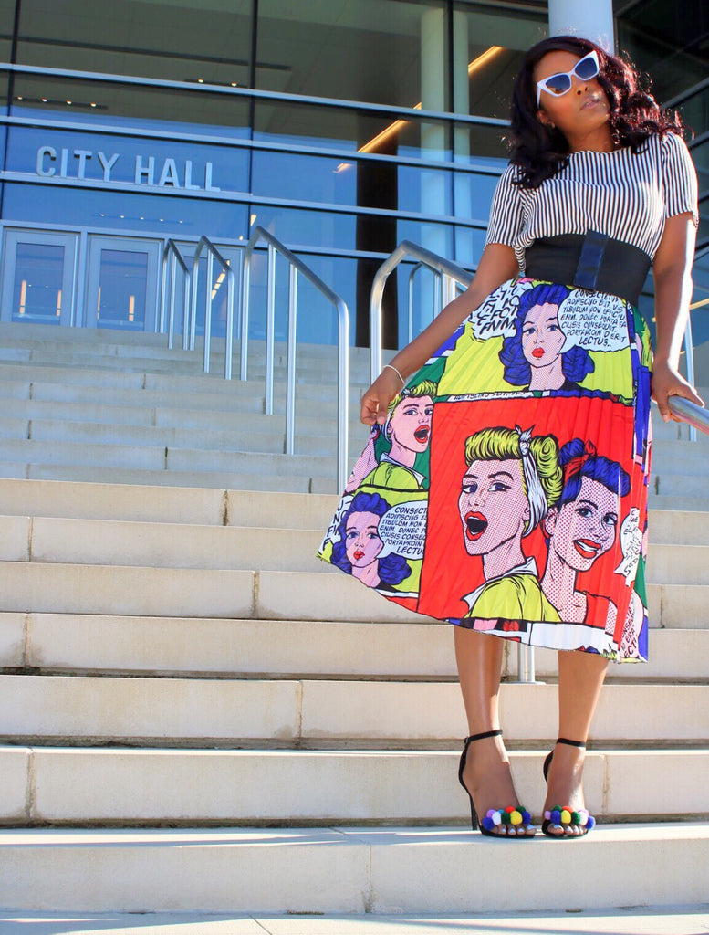 Get into this must-have midi skirt featuring a comic book design, deep pleats and an elastic waist that stretches to fit an XL. One size fit.