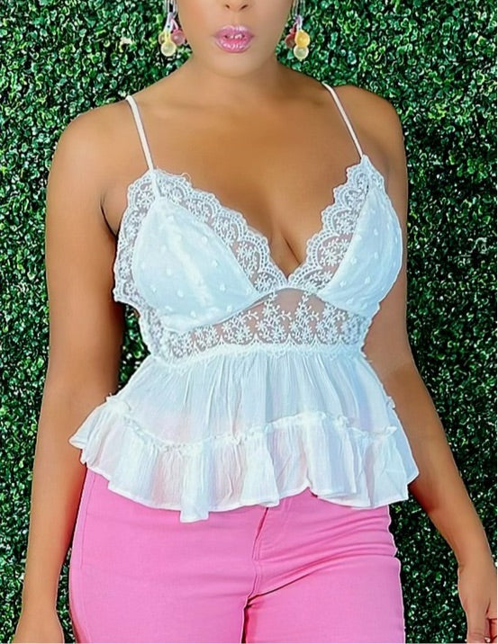 Dainty, white peplum style top with spaghetti straps and lace detailing on the bust and midsection.