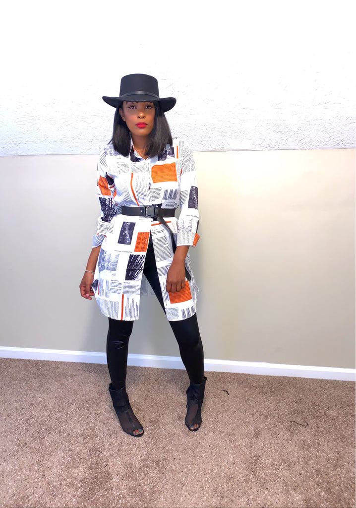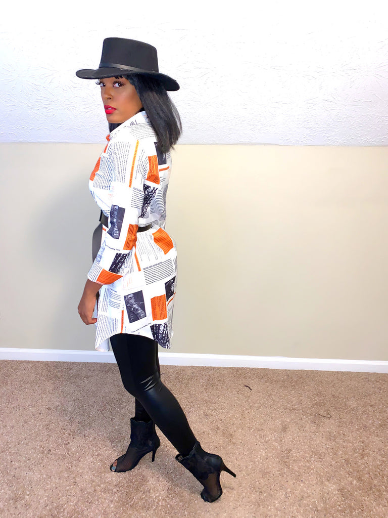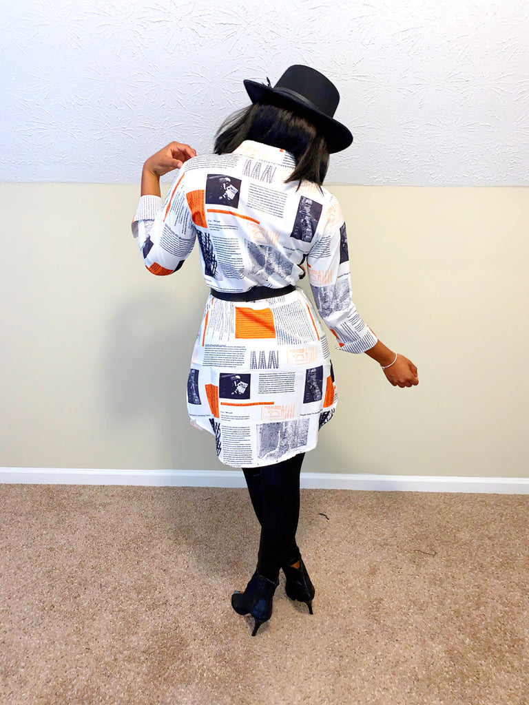 Long tunic button down with class notes written all over. Good stretch. Will fit up to a large.