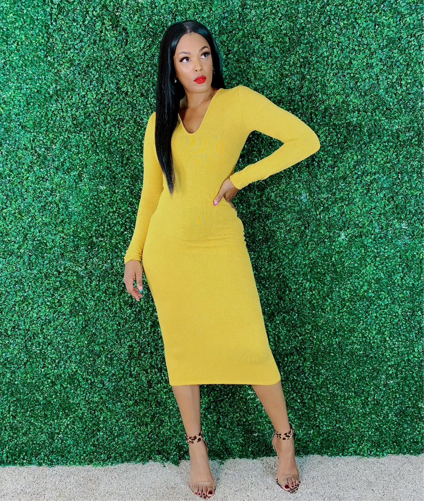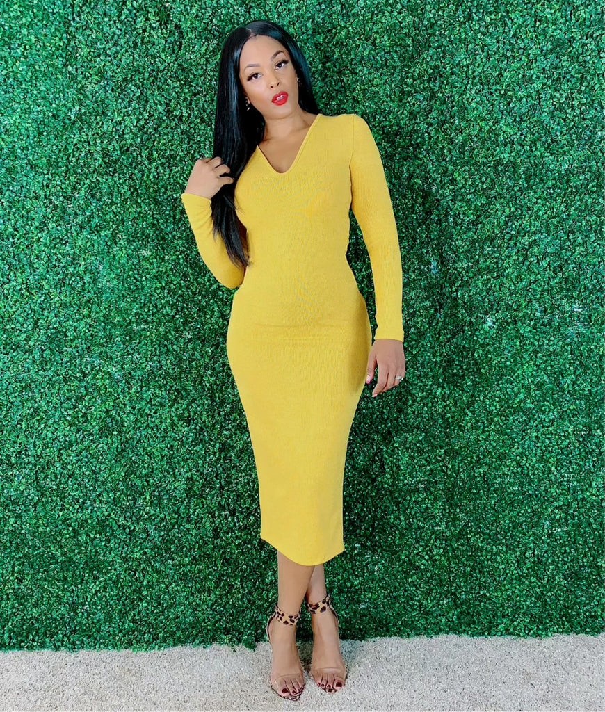 Let this stretchy body con midi hug all your curves to protection. It’s a must have dress for the fall. So simple yet elegant with a splash of sexy. We accessorized this dress with our Abstract handbag.
