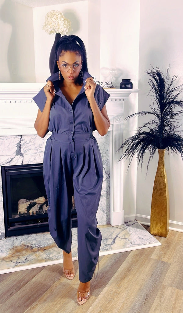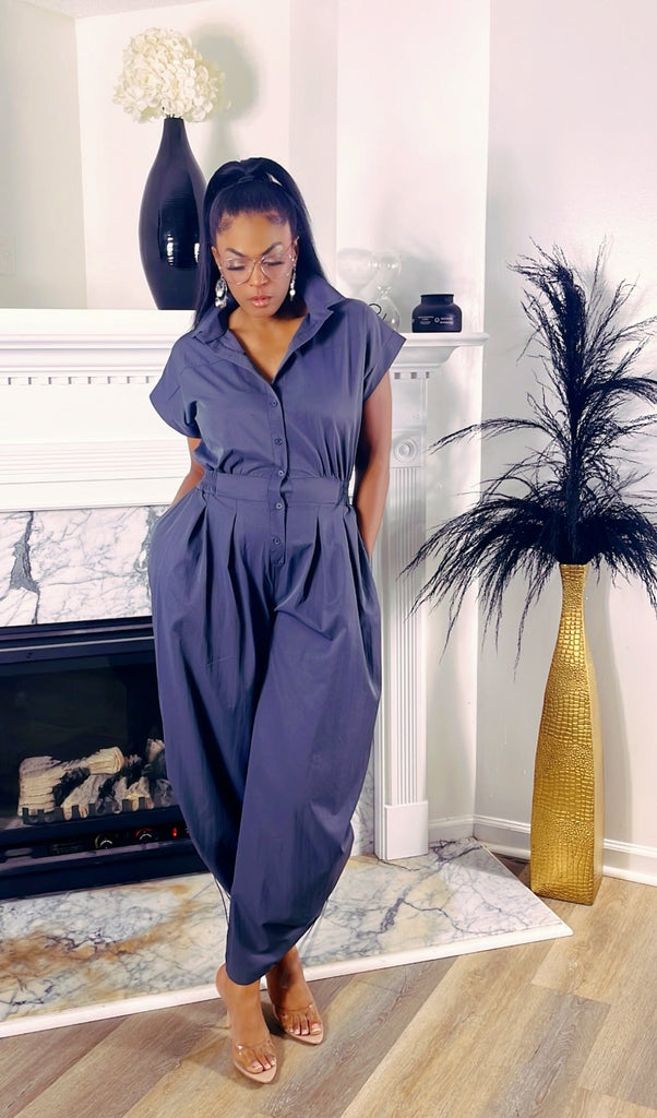 Command the room in a piece that perfectly balances structural precision with effortless movement. This slate-grey utility jumpsuit is designed for the woman who demands both a high-fashion silhouette and functional ease.