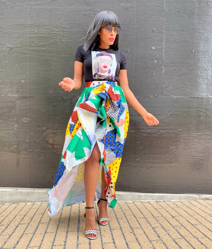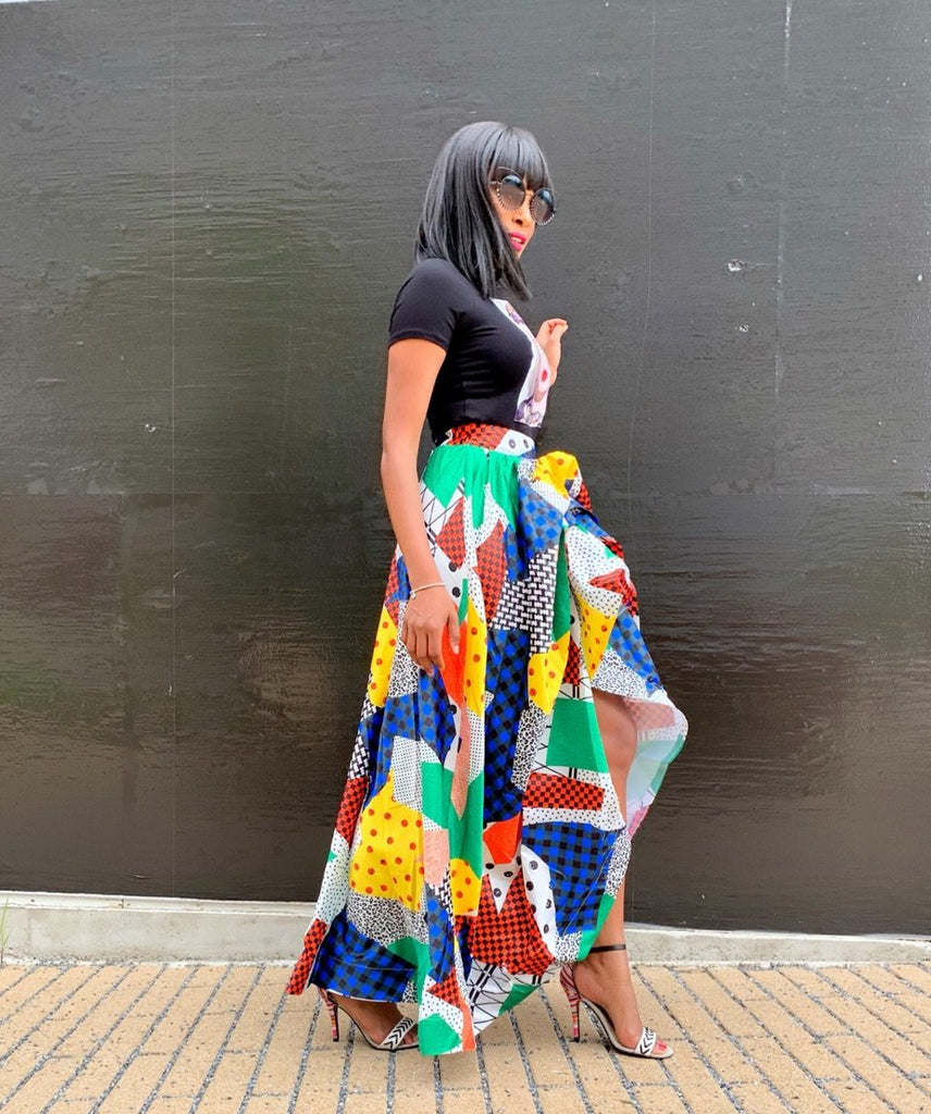 Abstract maxi skirt with ruffles featuring elastic waist.