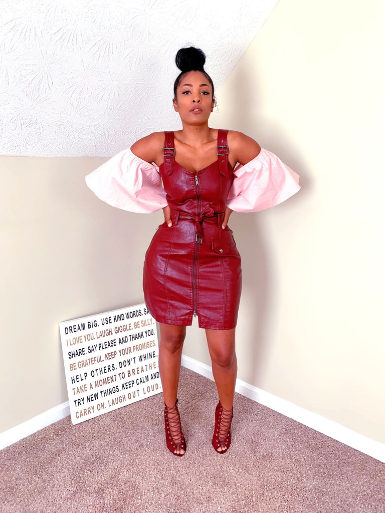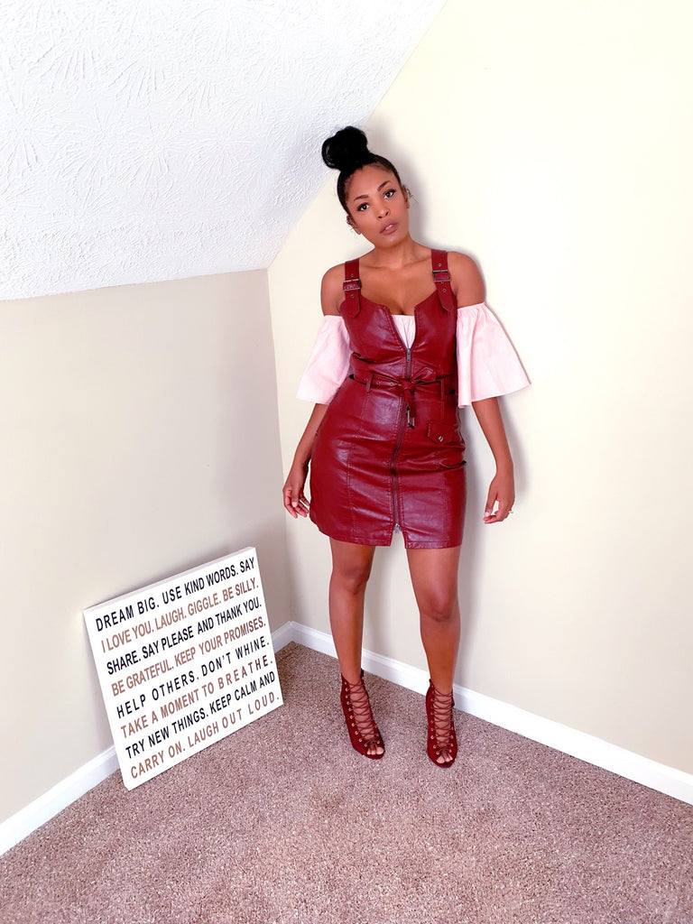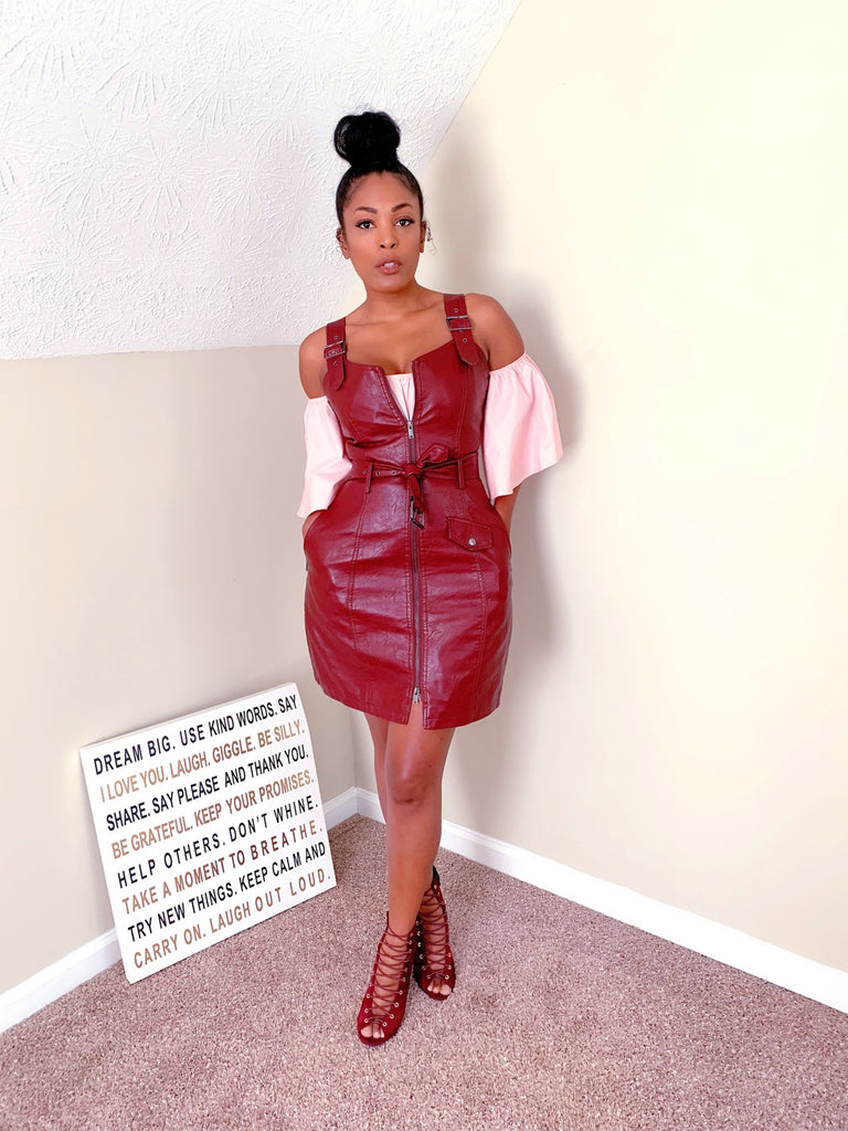 Scarlet red, leatherette, overall mini dress featuring front zipper closure, adjustable straps, side pockets matching belt and metal hardware. This dress fits true to size. Some stretch.