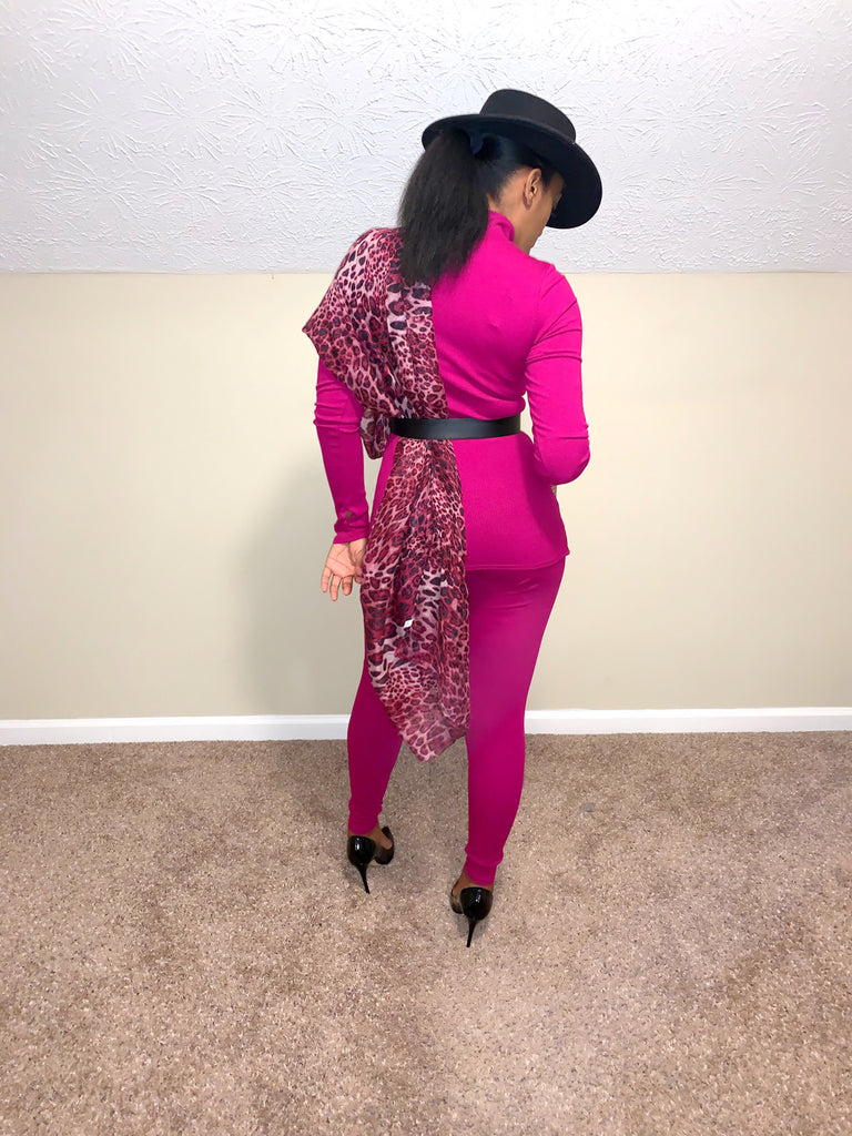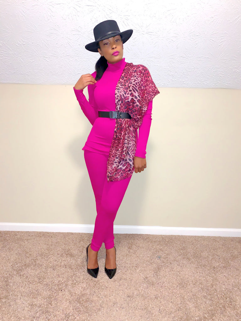 The color, the stretch, the feels of this set is a whole vibe! Super thick, turtleneck top with long high waist pants. Matching pink leopard scarf included.