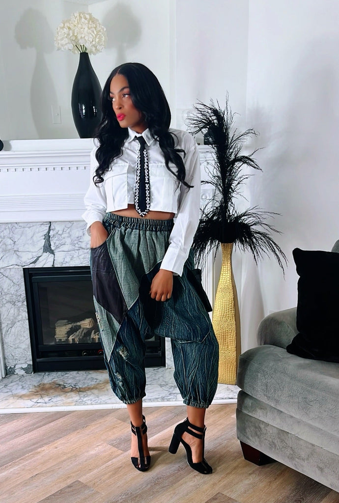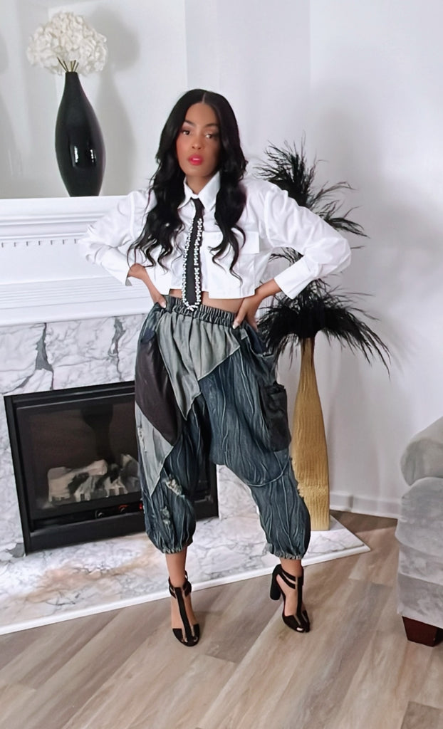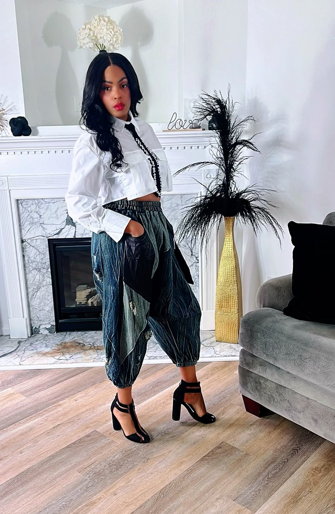 Own the fashion influencer spot in these loose fitting, denim harem pants with contrasting denim and faux leather patchwork. Elastic waist and side pockets.