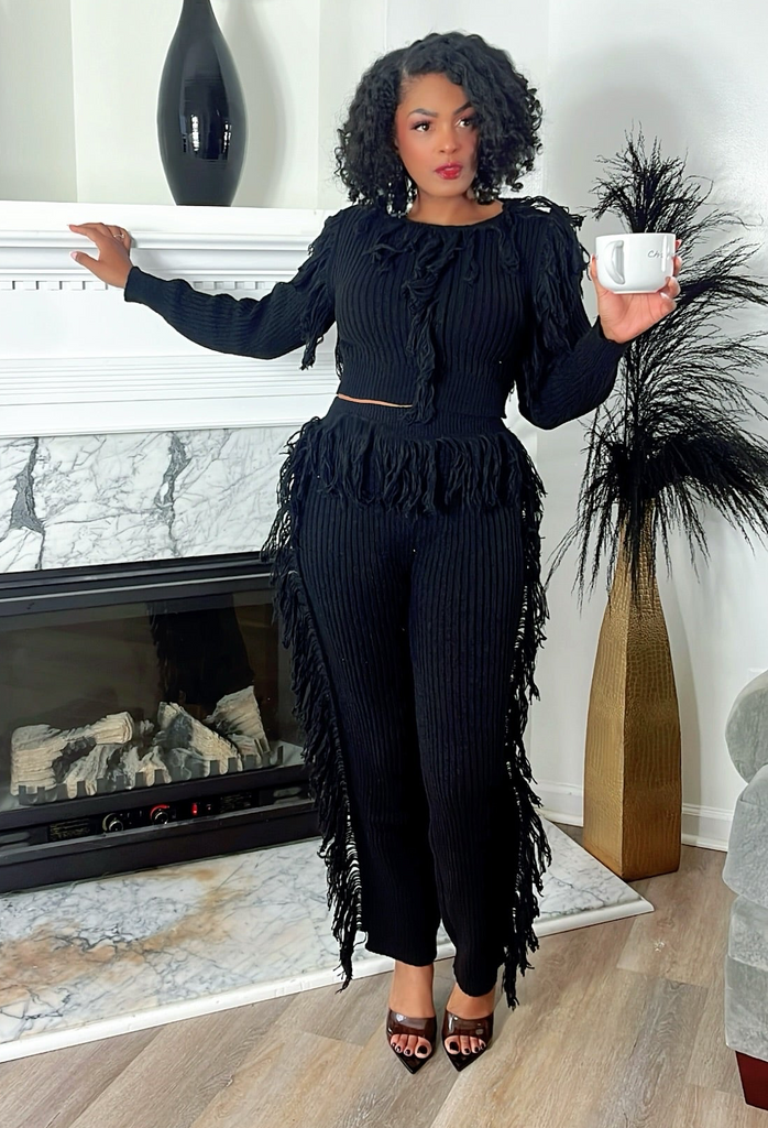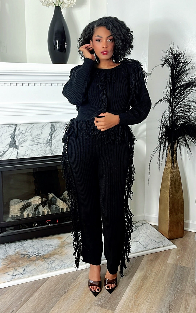 Two piece, fringe sweater set that is perfect for going out or looking cute indoors. The sweater material is extremely  stretchy and soft.