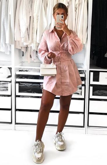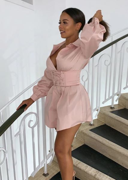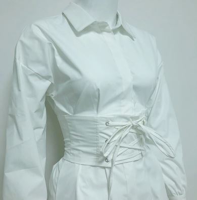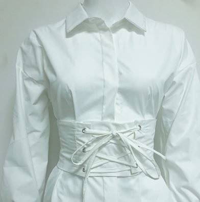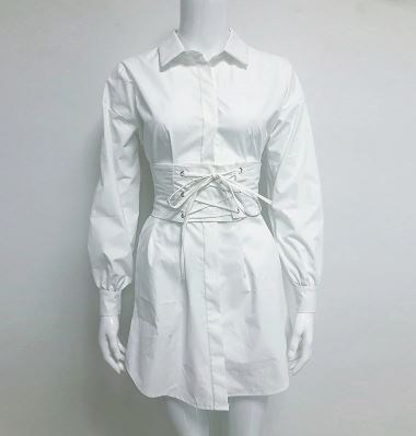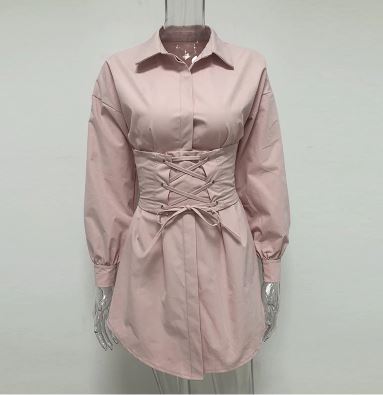 Long sleeve mini shirt dress with matching corset belt that zips in the back and cinches the waist.