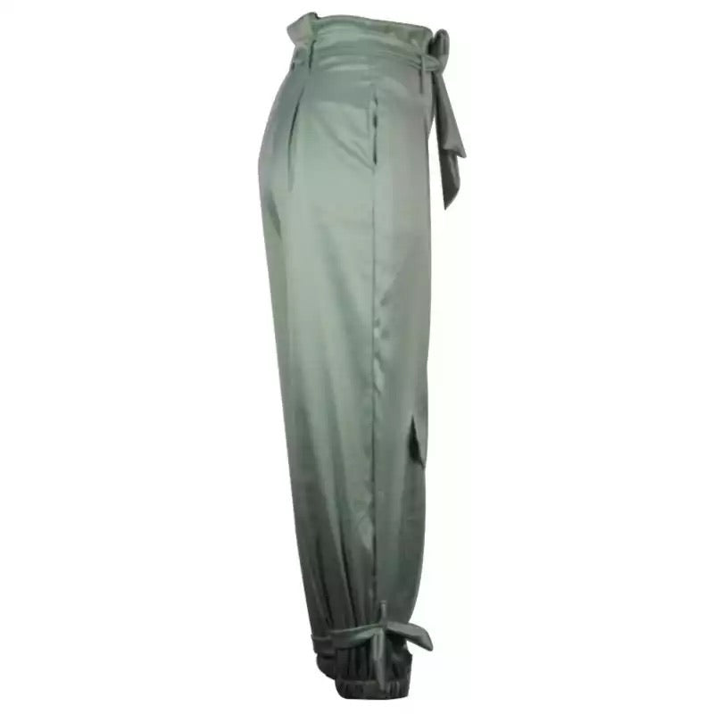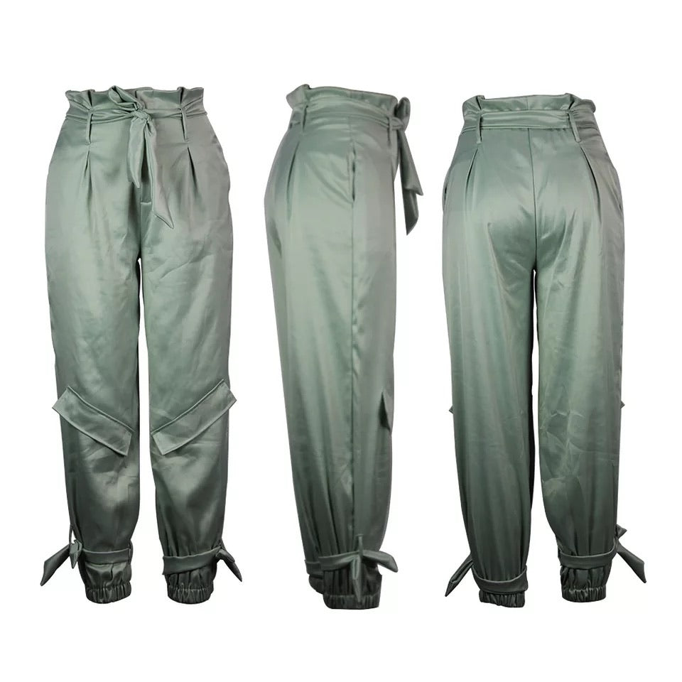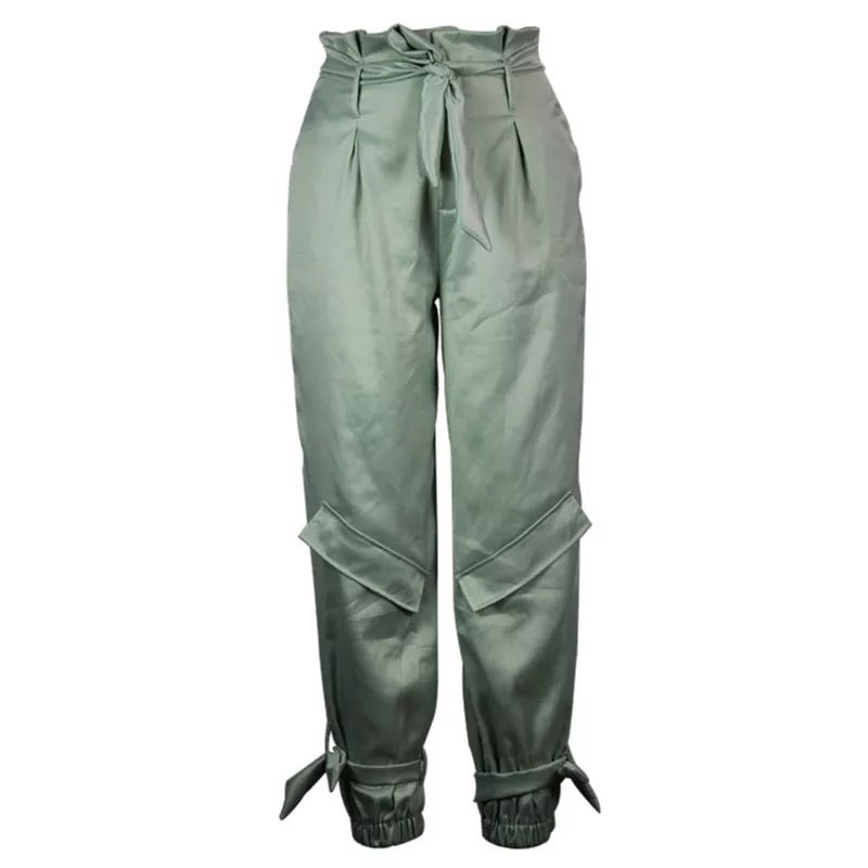 Casual light green high waist paper bag joggers with side pockets and ties around the ankles.