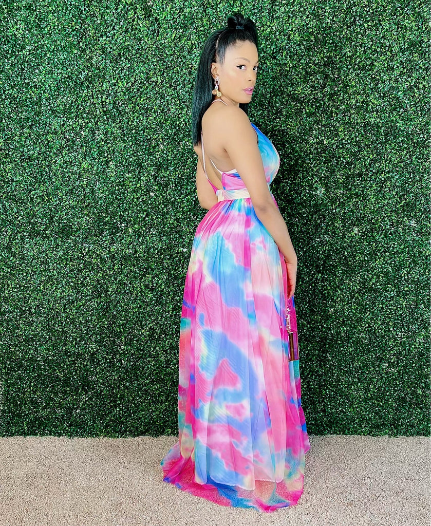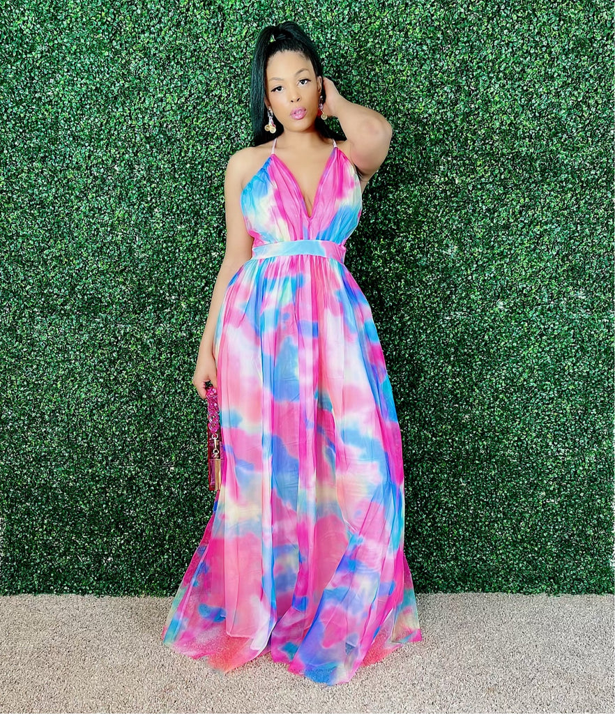 We can’t get enough of this absolutely gorgeous, empress-style maxi dress with adjustable straps that cross in the back. The dress features a colorful organza overlay on top a full lining. It has a zipper closure in the back. It’s perfect for vacay, weddings, or any upscale occasion.