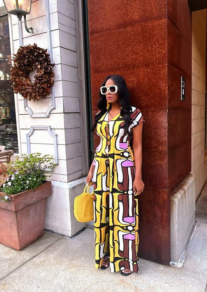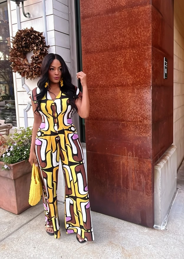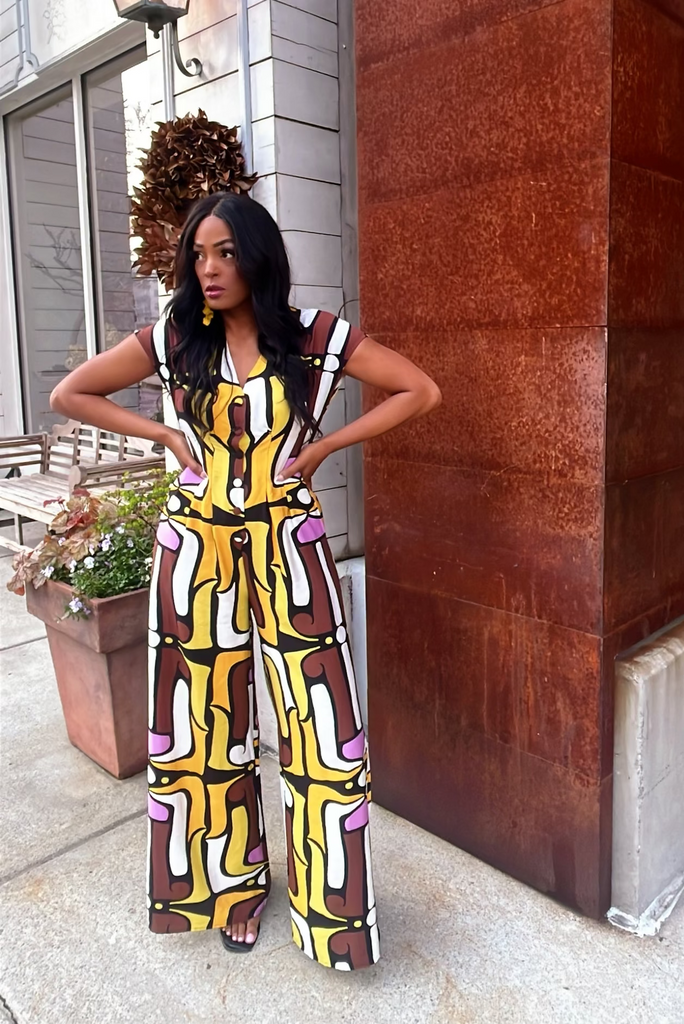 A jumpsuit that is a statement on its own. Features a loose fit. wide leg bottoms, pockets and elastic waist in the back to step in easily.
