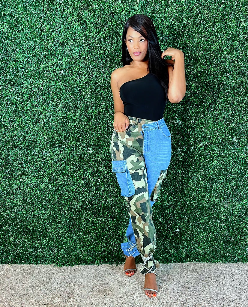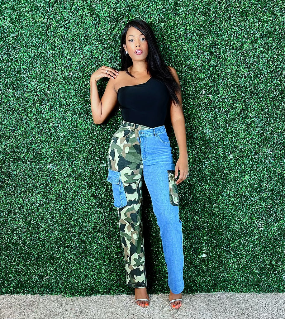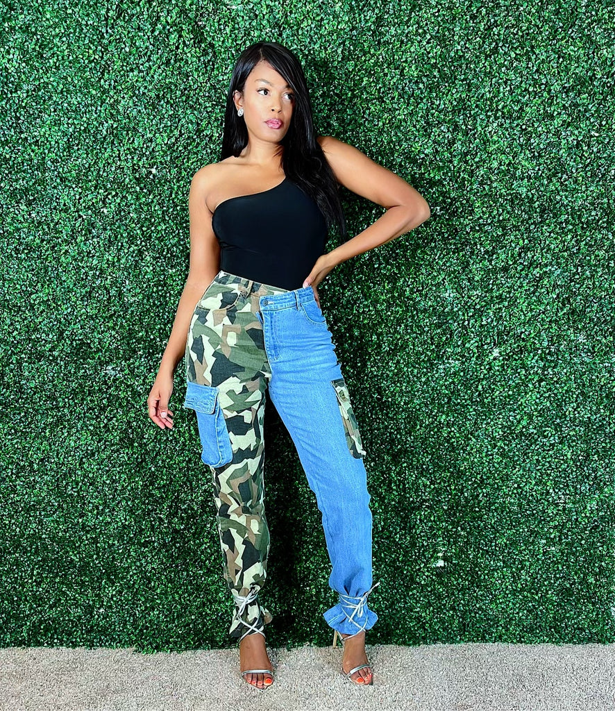 It’s giving YES MA’AM! These high waist, splot Camo anddenim, cargo pants have so many amazing details from the irregular button closure to the contrast denim and Camo to the oversized cargo pocket … not to mention their AMAZING STRETCH! These jeans also have four pockets, excluding the oversized pockets. They are 🔥🔥🔥